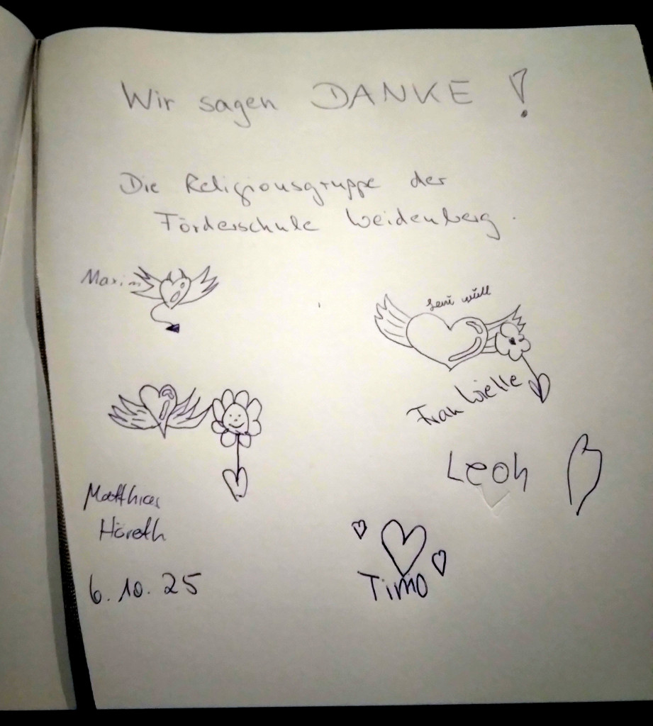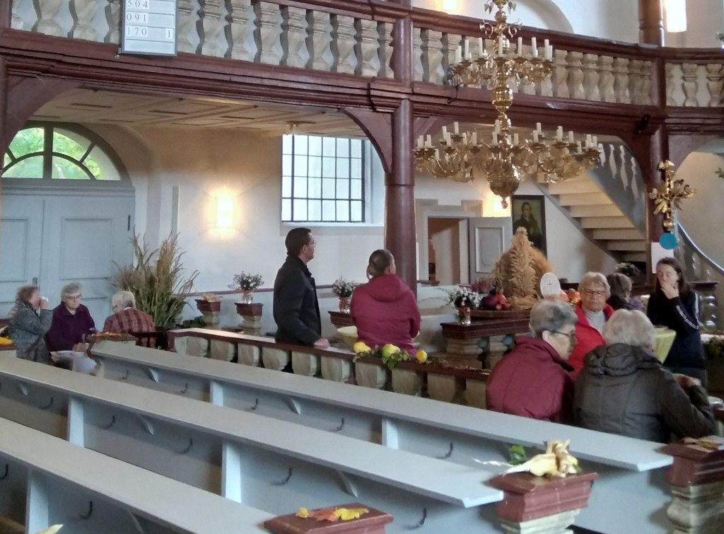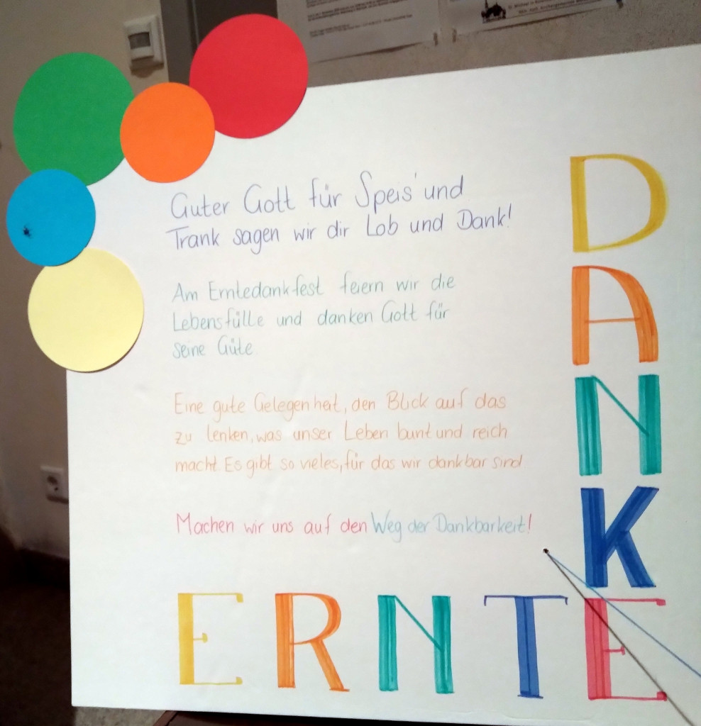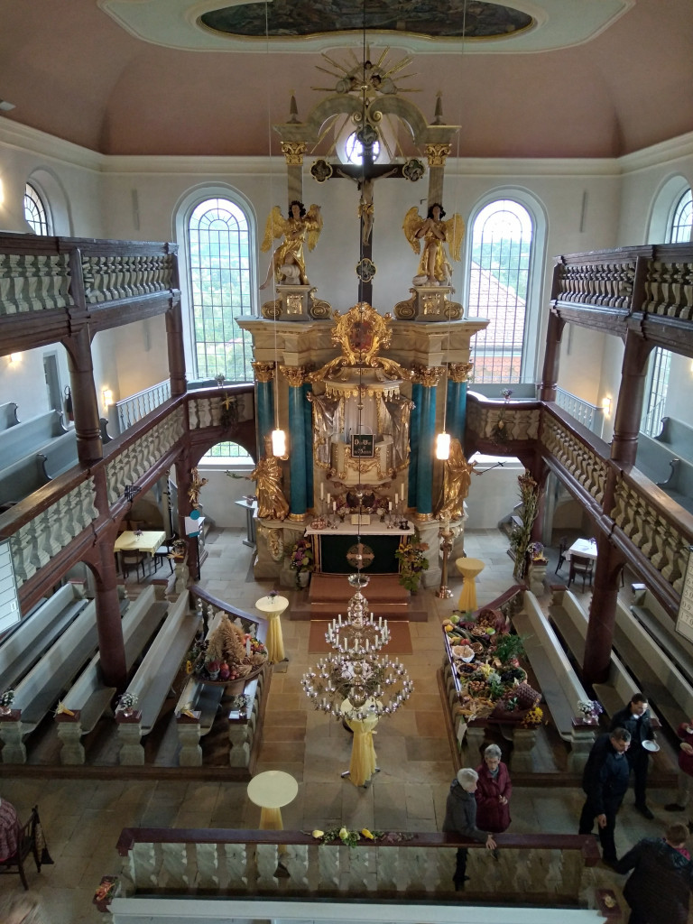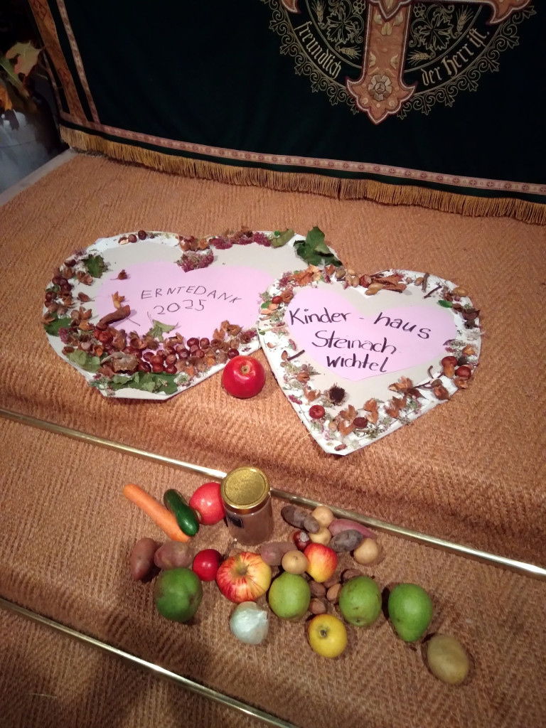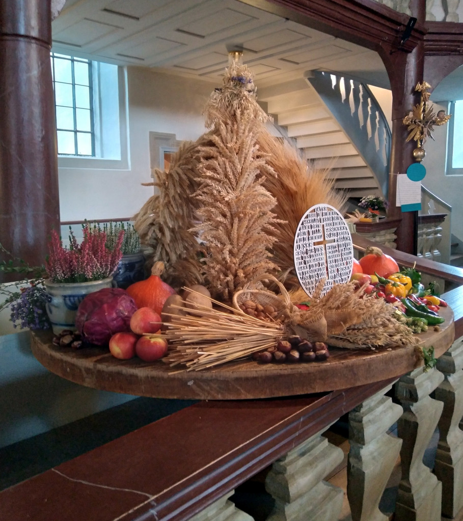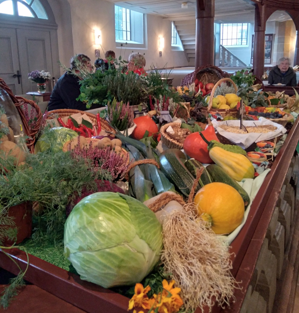 Mit einem Abendmahlsgottesdienst feierte die Gemeinde um 9.30 Uhr das Erntedankfest mit Diakon Günther Wagner, dem Posaunenchor und Christine Hammer an der Orgel. Am Nachmittag gab es einiges zu erleben. Um 14.00 Uhr öffnete das „Kirchen-Cafe mit Kuchenbüfett“ im Kirchenraum. Für die Kinder war ein Stationenweg errichtet. Auf diesem konnten Erwachsene und Kinder dem "Erntedank", entlang des roten Fadens, nachgehen. Um 15.00 Uhr gingen 9 Erwachsene und Kinder mit Erika Gstaiger hinauf auf den Turm bis zu den Glocken.
