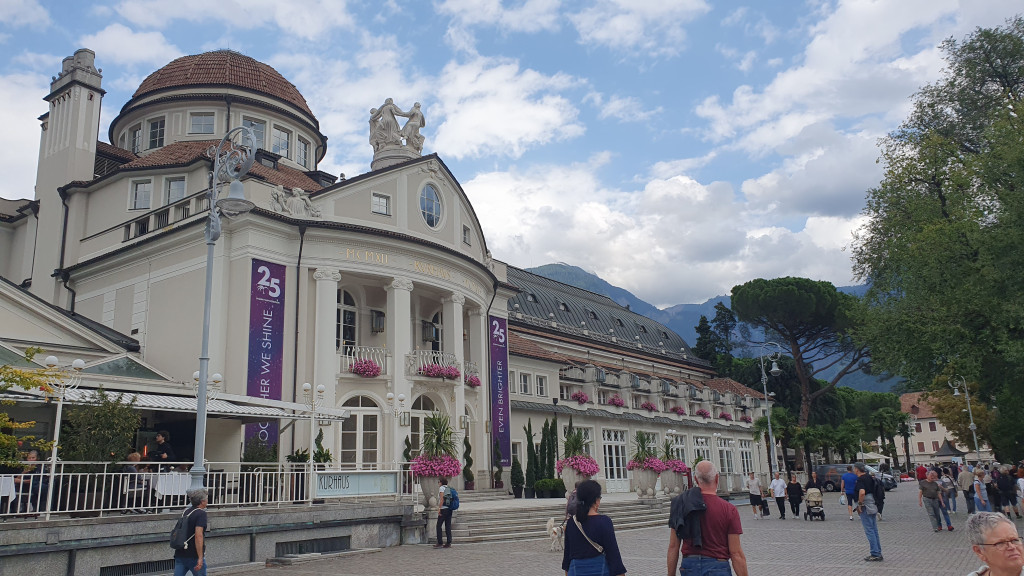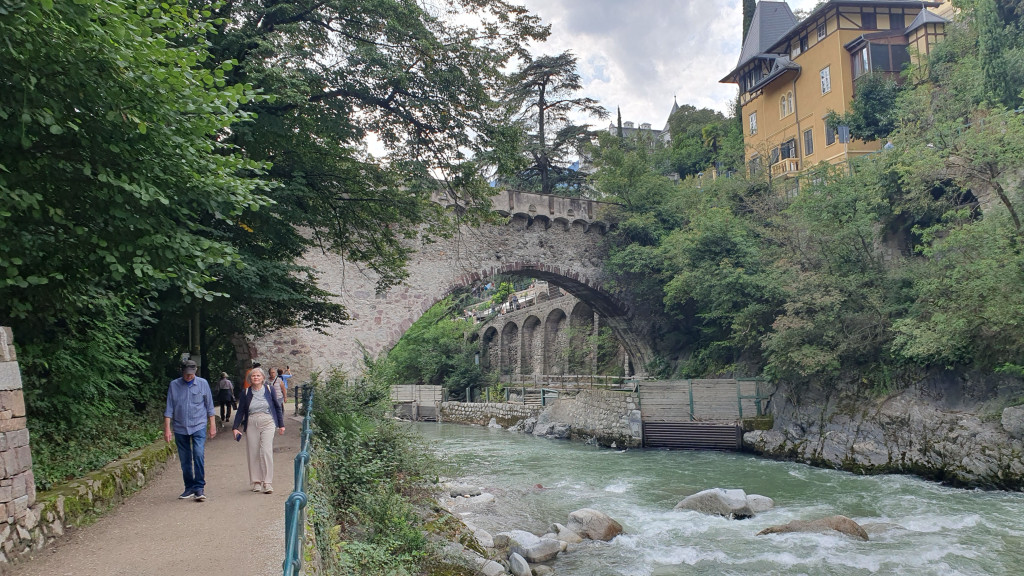 Am Nachmittag fuhren wir alle gemeinsam nach Meran. Meran ist durch Kaiserin Sissy, die wir ja alle kennen, zu einem Touristenmagneten geworden. Hier konnten wir unabhängig voneinander gemütlich Stadt und Fluss (die Passer) erkunden. Rund um die Stadt gibt es da beispielsweise Möglichkeiten über den „Sissy Weg“, die „Laubengänge“ oder zum „Schloss Trautmannsdorff“ mit seinen Gärten, oder man kann auch einfach nur das Leben in der Stadt mit seiner Promenade am Fluss, den vielen Cafés und Geschäften genießen.