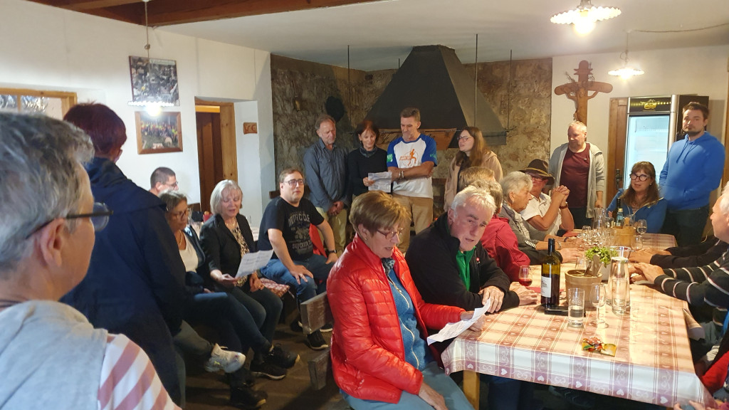 Donnerstag, 1. Tag: Um 6:30 Uhr fanden wir uns beim Bus am Wutschka-Parkplatz ein, das Gepäck wurde verladen, und dann ging es schon los. Wir hatten ja eine lange Fahrt vor uns. Rund 570 Kilometer bis zum Ziel. Entgegen unserer Befürchtungen sind wir aber sehr gut durchgekommen und waren gegen 17:00 Uhr an unserem Hotel „Zum Hirschen“. Wir hatten sogar noch reichlich Zeit einzuchecken und uns danach ein bisschen in der näheren Umgebung umzusehen. Ab 19:00 Uhr waren wir dann zu einem Empfangsaperitiv in der Gemeindeverwaltung eingeladen. Der überaus herzliche Empfang von Gemeindevertretern und Trachtenkapelle hat uns total überwältigt. Der Empfang dauerte natürlich länger als geplant – man traf etliche Bekannte wieder - ,aber das danach stattgefundene Abendessen hat uns allen wunderbar gemundet. Zu meiner Überraschung verfolgt das Hotelrestaurant eine klare Naturphilosophie mit Speisen und Getränken aus der Region. Etliches wie gesunde Säfte zum Beispiel, stellen sie sogar selber her. Was nicht heißt, dass die Einheimischen dort dem Wein oder dem Bier abgesagt hätten. Im Gegenteil - beides geht wunderbar zusammen. Wir haben also durchweg gesund gelebt, da wir immer dort abends noch gegessen und getrunken haben.