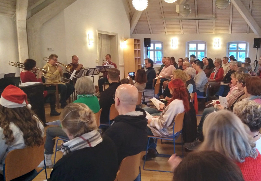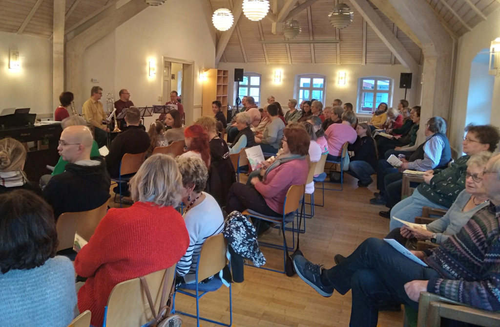 Zwischen den Jahren ins „Pimmlerhaus“. Christine und Klaus Hammer hatten eingeladen und viele kamen. Am Sonntag, 28. Dezember 2025 um 15.00 Uhr füllte sich der Saal im Gemeindehaus mit singbegeistertem Publikum. Begleitet von einer Bläsergruppe, Akkordeon, Gitarre und Klavier hatten Große und Kleine viel Spaß am Singen der altbekannten Weihnachtslieder.